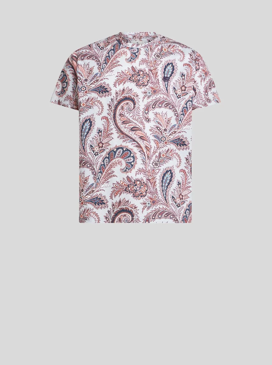 Cotton T-shirt embellished with floral Paisley print all over. This model is complete with a contrasting embroidered Pegaso symbol and ETRO logo on the chest. • Roma regular fit • Crewneck • Short sleeves • Made in Italy • The model is 6' 1½" (187 cm) tall and wears a size M PRODUCT DETAILS • 100% cotton