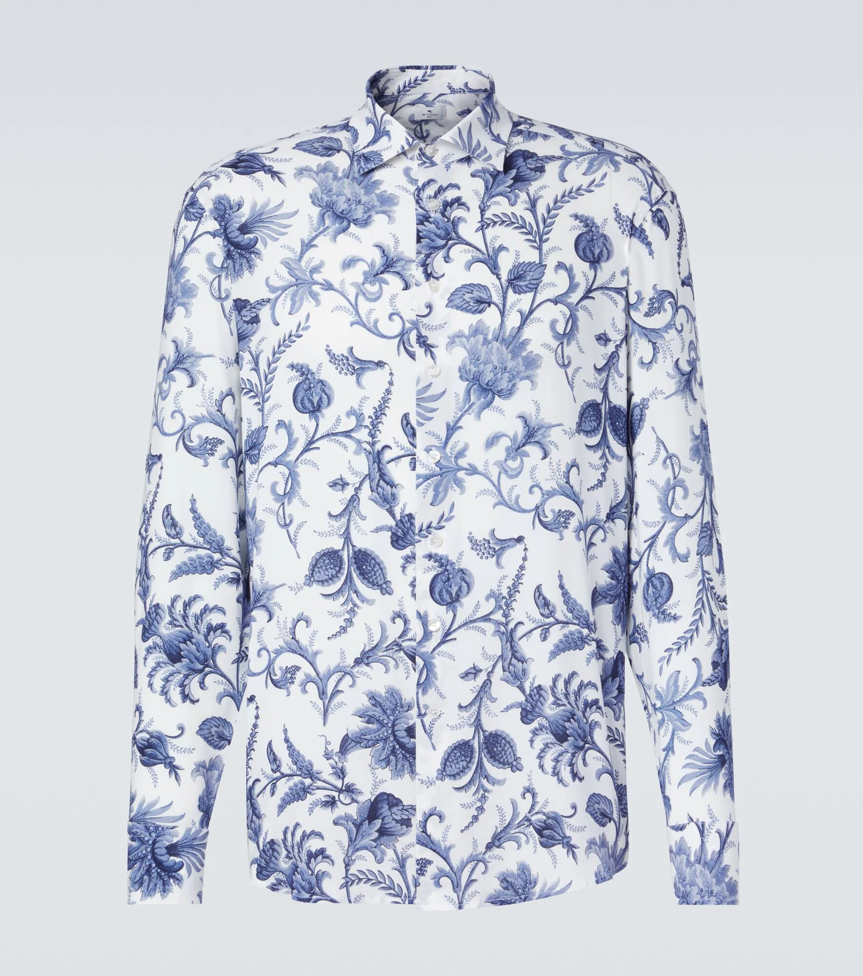 Gerolamo and Roberta Etro's love for antique prints and patterns remain a cornerstone of the Italian brand today. This shirt features a blue floral print on a white base. Product Details - Material: 97% viscose, 3% elastane - Care instructions: dry clean - Made in Italy - Color: blue - Designer color name: Print On White Base - Item color: white, blue - Collar: classic (Straight point) - Closure: buttoned front - Cuff: buttoned - Item number: P01135096 Size & Fit - True to size - Without pleats in the back - Classic fit - Slightly stretchy fabric - Falls below the hip - Height of model is 189cm-74.5" and wears a size EU 41