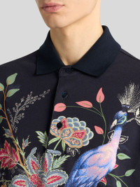 Pure cotton pique polo shirt with placed print depicting a peacock and floral patterns. Completing the garment are the plain-coloured sleeve ends and collar. • Roma regular fit • Short sleeves • Made in Italy • The model is 6' 1½" (187 cm) tall and wears a size M PRODUCT DETAILS • 100% cotton