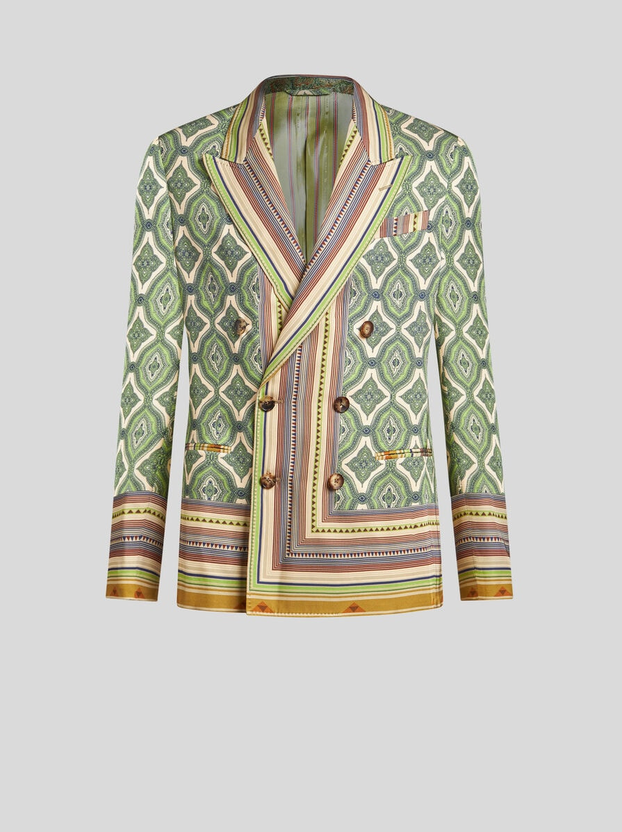 Double-breasted blazer with medallion motif accompanied by stripes in the middle and at the bottom. Inner lining embellished with printed vertical stripes of varying width. • Roma regular fit • Peak lapels • Double-breasted closure with buttons • Front pockets with flap • Made in Italy • The model is 6' 1½" (187 cm) tall and wears a size 48 PRODUCT DETAILS • 100% viscose • Lining: 52% viscose, 48% acetate