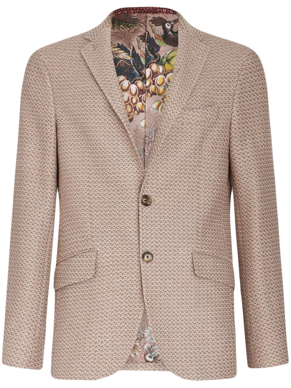 patterned-jacquard cotton blazer Showing the brand's love for bold prints and details, this single-breasted blazer from ETRO is enhanced by a colourful pattern inside. Crafted from cotton, it has a classic straight cut in pink. Highlights - Light brown - Cotton - Patterned jacquard - Notched lapels - Front button fastening - Long sleeves - Buttoned cuffs - Chest welt pocket - Two side flap pockets - Straight hem - Floral-print lining Made in Italy Composition Outer: Cotton 100% Lining: Viscose 100% SIZE & FIT FittingInformation Designed for a slim fit, offering a comfortable fit that sits just away from the body The vented hem offers movement at the rear Made from a midweight non-stretch fabric This piece fits true to size – take your usual size Washing instructions Read Manufacturer Guidelines