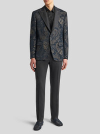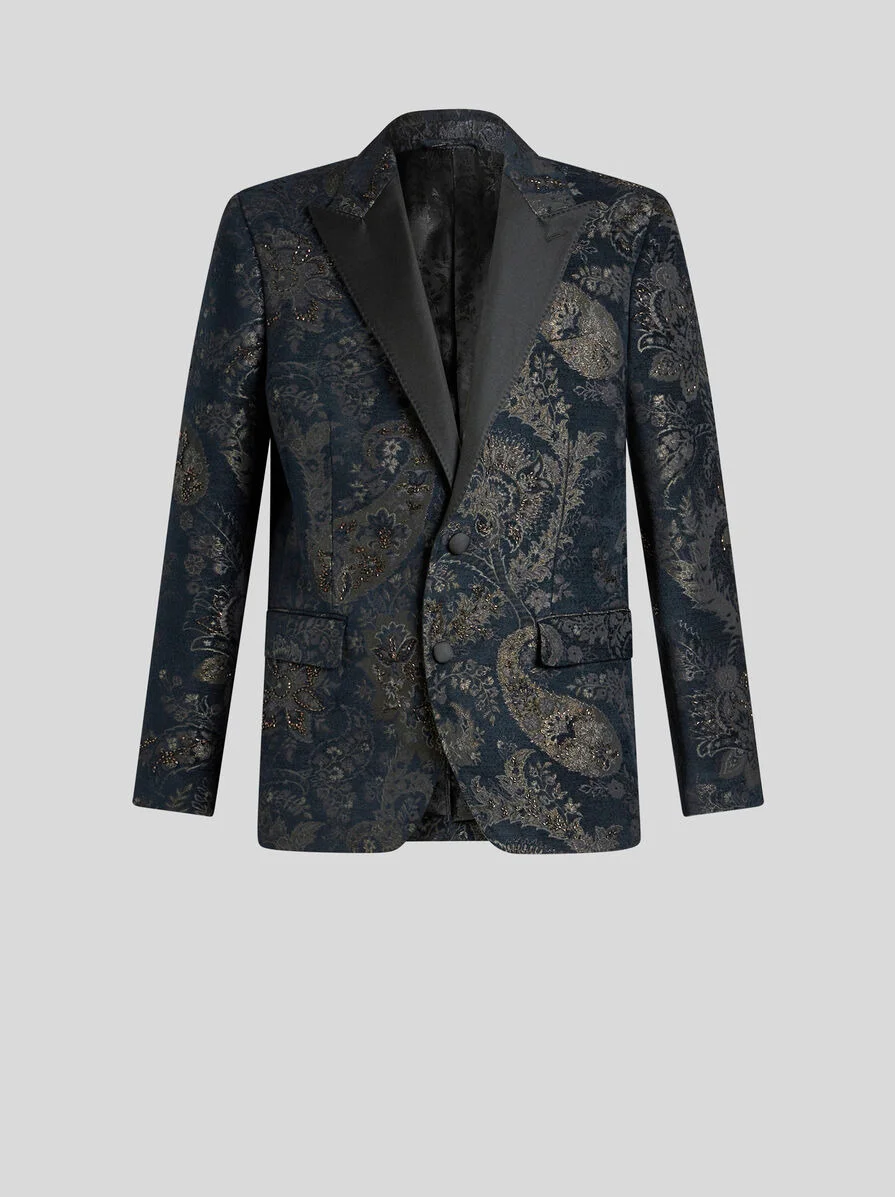 Single-breasted jacquard blazer with embroidery and silk lapels. This model features a contrasting floral Paisley-patterned undercollar and inner lining embellished with a tone-on-tone jacquard motif. • Regular fit • Peak lapels • Single-breasted button closure • Welt breast pocket • Welt side slip pockets • Working cuffs • Rear vent • Made in Italy • The model is 6’1”(186 cm) tall and wears a size 48 (IT) PRODUCT DETAILS • 60% wool, 40% mohair • Embroidery: 100% polyester • Neck: 78% silk, 22% polyester