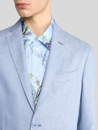 Single-breasted blazer in pure cotton fabric with light-coloured all-over Paisley jacquard motif. The garment is complete with a contrasting undercollar and lining with a peacock motif and floral print. • Roma regular fit • Single-breasted two-button closure • Side slip pockets with flap • Made in Italy • The model is 6' 1½" (187 cm) tall and wears a size 48 PRODUCT DETAILS • 100% cotton • Bodice lining: 100% viscose • Sleeve lining: 52% viscose, 48% acetate