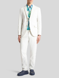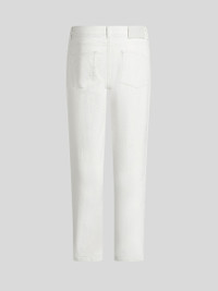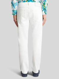 Jeans in stretch cotton denim with an all-over tone-on-tone jacquard motif. This five-pocket model is embellished with a leather label featuring the Pegaso symbol and ETRO logo. PRODUCT DETAILS • 98% cotton, 2% elastane • Regular fit • Covered button and zip closure • Rear leather label with ETRO logo and Pegaso • Made in Italy • The model is 74.01" (188 cm) tall and wears a size 32 (IT)
