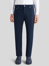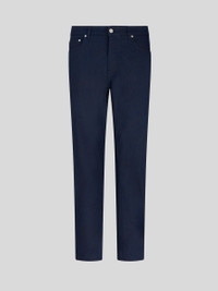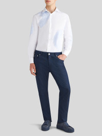 Jeans in stretch cotton denim with an all-over tone-on-tone jacquard motif. This five-pocket model is embellished with a leather label featuring the Pegaso symbol and ETRO logo. • Regular fit • Covered button and zip closure • Rear leather label with ETRO logo and Pegaso • The model is 73.6" (187 cm) tall and wears a size 32 (IT) • Made in Italy PRODUCT DETAILS 56% cotton, 3% elastane, 41% polyester