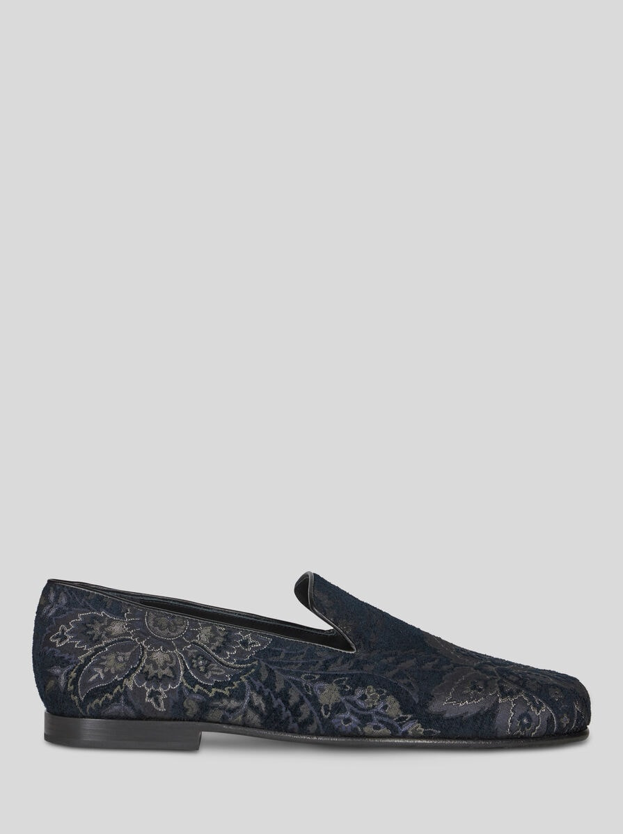 Jacquard fabric loafers with leather details, embellished with an Arabesque motif all over. This model is enhanced by the printed Pegaso symbol and ETRO logo on the sole. • Made in Italy PRODUCT DETAILS • Upper: 52% viscose, 36% polyester, 12% modal • Lining: 100% calfskin • Insole: 100% calfskin