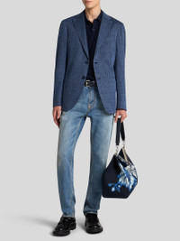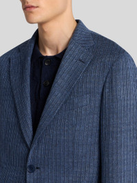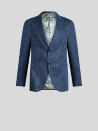 Casual linen-blend jersey blazer with a distinctive striped design. This piece features a foliage print on the lining. The contrasting undercollar complements the design. • Roma regular fit • Classic lapels • Single-breasted closure with branded buttons • Welt breast pocket • Patch pockets on the front • Cuffs with four buttons • Made in Italy • The model is 6' 1½" (187 cm) tall and wears a size 48 PRODUCT DETAILS • 51% viscose, 49% linen • Bodice lining: 100% viscose • Sleeve lining: 57% viscose, 43% polyester