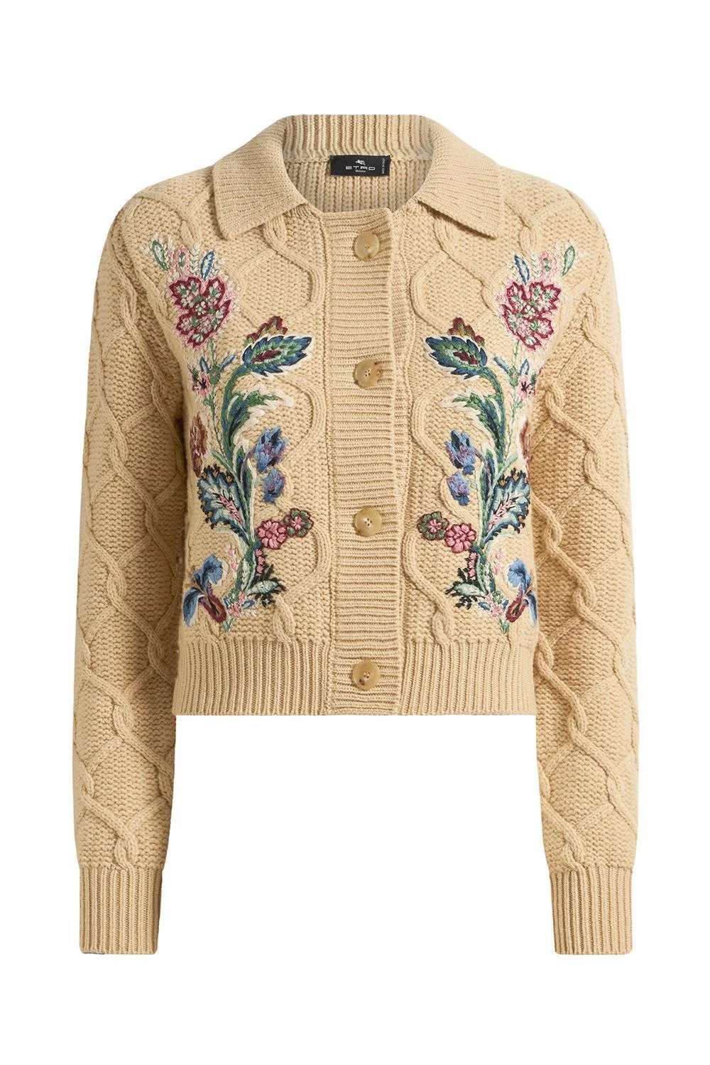 DETAILS AND INSIGHT Etro knit collared jacket in beige. 90% Wool 10% Cashmere Professionally Clean Made In Italy Style WRKP0007AV706M3791