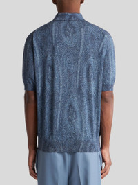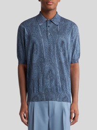 Knit polo-shirt made from a silk and cashmere-blend yarn, featuring an all-over paisley-stamped print. This model is embellished with a tone-on-tone embroidered Pegaso symbol and ETRO logo on the chest. • Regular fit • Fine-rib 1 x 1 trims • Made in Italy • The model is 6’2” (188 cm) tall and wears a size M PRODUCT DETAILS • 55% silk, 45% cashmere
