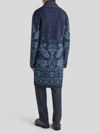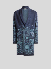 Robe in pique-stitched pure wool jacquard fabric. This garment features a decorative, placed floral motif, comprising a tone-on-tone upper part and contrasting part lower down and on the sleeves. • Regular fit • Shawl lapels • Single-breasted, single-button closure • Patch pockets on the front • Made in Italy • The model is 6' 1½" (187 cm) tall and wears a size M PRODUCT DETAILS • 100% wool