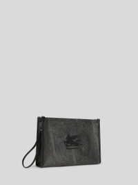 Large pouch made from iconic Paisley jacquard fabric. This accessory is enhanced by the embroidered ETRO logo and Pegaso symbol on the front. The inner lining features a striped pattern. • Size: 7.87 x 11.81 x 1.97 inches (20 x 30 x 5 cm) • Zip closure • Detachable wrist strap • Internal patch pocket • Logo-branded inner label • Striped fabric lining • Made in Italy PRODUCT DETAILS • Exterior: Paisley jacquard cotton fabric coated with matt texture and lined with canvas • Detailing: 100% calfskin • Interior: 100% polyester • Coating: 100% PVC