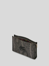 Large pouch in ETRO's iconic Paisley jacquard fabric embellished by 3D-effect embroidered ETRO Pegaso logo and features a detachable wrist strap. PRODUCT DETAILS • 30 x 20 x 5 cm / 11.81 x 7.87 x 1.96 inches • Exterior: 76% cotton. 24% polyester • Finish: 100% calfskin • Interior: 100% polyester • Embroidery: 100% polyester • Zip fastening • Inside patch pocket • Detachable wrist strap length (drop) 18 cm / 7.08 inches • Gold-finish metal accessories • Made in Italy