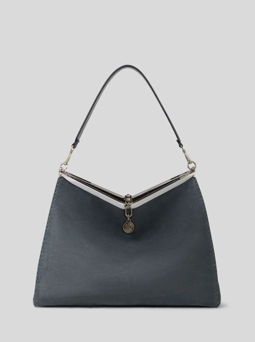 Large Vela bag in soft, tumbled nubuck leather with metal chain closure enhanced by a medallion bearing the ETRO logo and Pegaso symbol engraved using the same technique used to mint coins. Complete with a convenient inner clutch with zip closure. This bag is perfect to carry on the shoulder or crossbody. • Dimensions (Width, Height, Depth): 16.5 x 10.2 x 7.5 inches (42 x 26 x 19 cm) • Short handle, length (drop) 10.6 inches (27 cm) • Detachable adjustable shoulder strap, 17.3 inches (44 cm) long (drop) • Metal feet • Removable mini pouch • Silver-finish metal accessories • Made in Italy PRODUCT DETAILS • Calfskin • Shoulder strap: 95% polyester, 5% polyamide • Lining: calfskin