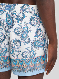 Technical canvas swim shorts with decorative, placed leafy Paisley print and contrasting plain-coloured edges. This model is complete with a small label featuring the Pegaso logo at the back. • Regular fit • Elasticated waist with drawstring • Side slip pockets • Made in Italy • The model is 6' 1" (186 cm) tall and wears a size M PRODUCT DETAILS • 100% polyester