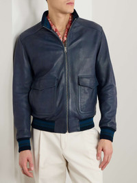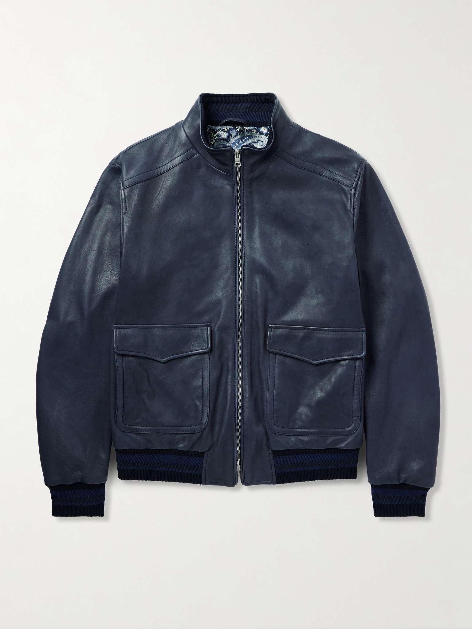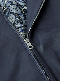 Etro's bomber jacket is crafted from leather in a rich midnight-blue that makes a nice change from black but is still just as versatile. It features patch pockets and a silver-tone zip in front, while the inside reveals a twill lining patterned with the brand's signature paisley. Size & Fit - Fits true to size. Take your normal size - Tailored for a regular fit - Ribbed hem - Supple, non-stretchy leather - Model is shown wearing a M - Model measures: chest 38"/ 96cm, height 6'2"/ 188cm Details & Care - Midnight-blue leather - Zip fastening - 100% leather (Lamb); lining: 53% viscose, 47% acetate - Dry clean