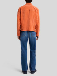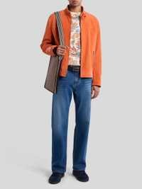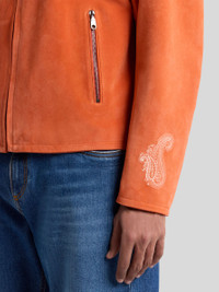 Leather jacket embellished with two contrasting Paisley embroideries on the sleeves. Completing the garment is, a button with raised Pegaso logo on the collar. • Regular fit • Stand-up collar • Zip closure • Side slip pockets with zip • Side straps with metal buckle • Made in Italy • The model is 6' 1½" (187 cm) tall and wears a size 48 PRODUCT DETAILS • Calfskin • Embroidery: 100% cotton • Bodice lining: 100% viscose • Sleeve lining: 52% viscose, 48% acetate
