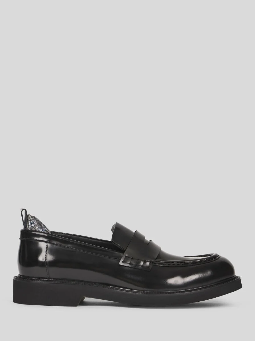 Leather penny loafers with rear silk-blend insert embellished with tie-inspired geometric micro motif. • Made in Italy PRODUCT DETAILS • Upper: 100% cowhide • Lining: 100% calfskin • Insole: 100% cowhide • Sole: 100% polyethylene • Tongue: 100% cowhide • Appliques: 70% polyester, 30% silk