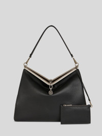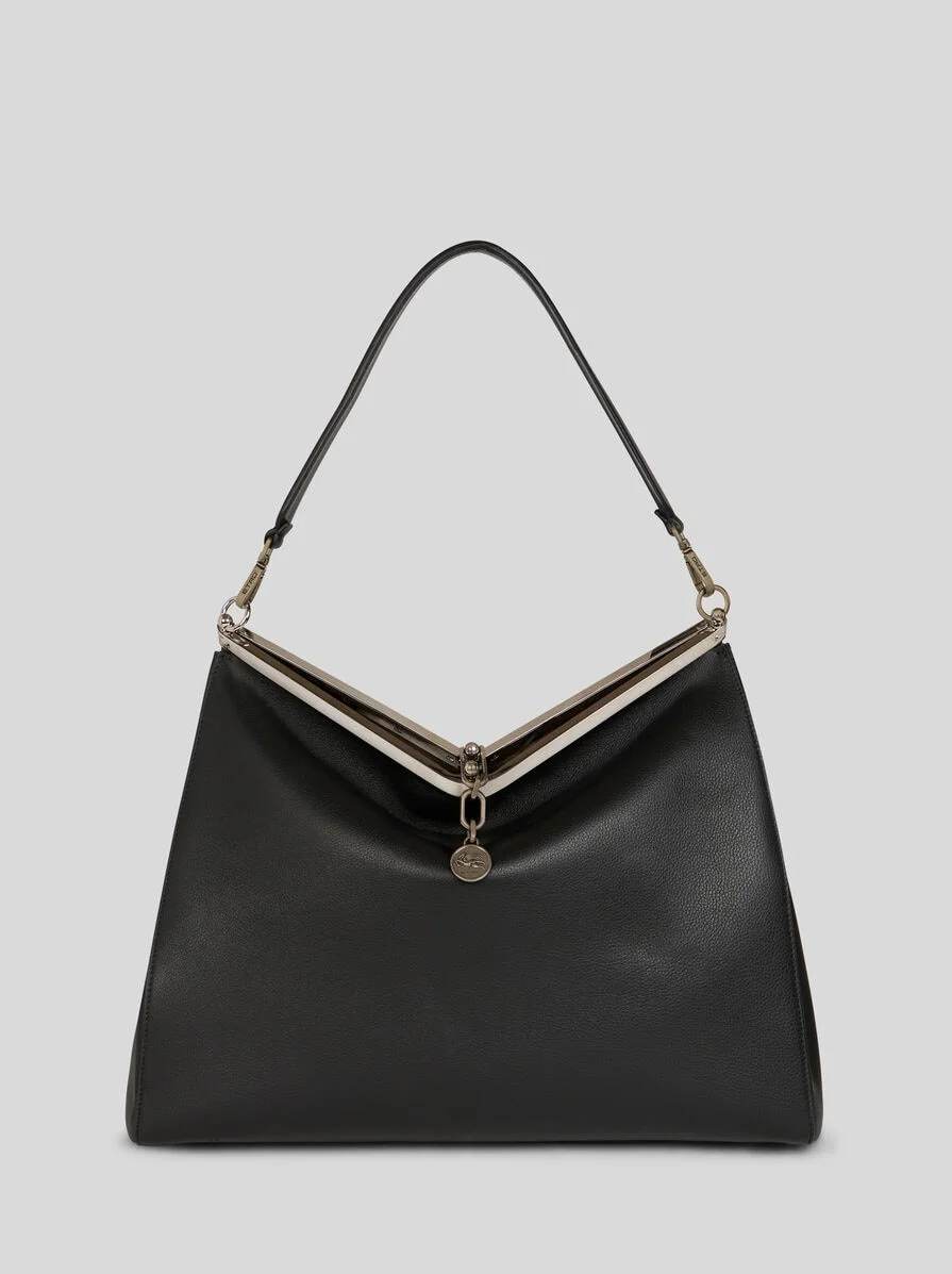 Large Vela bag in tumbled leather with metal chain closure enhanced by a medallion bearing the ETRO logo and Pegaso symbol. Complete with a convenient inner clutch with zip closure. This bag is perfect to carry on the shoulder or crossbody. • Dimensions (Width, Height, Depth): 16.5 x 10.2 x 7.5 inches (42 x 26 x 19 cm) • Shoulder strap: 95% polyester, 5% polyamide • Short handle, length (drop) 10.6 inches (27 cm) • Detachable adjustable shoulder strap, 17.3 inches (44 cm) long (drop) • Metal feet • Removable mini pouch • Palladium-finish metal accessories • Made in Italy PRODUCT DETAILS • Exterior: 100% calfskin • Trims: 100% calfskin • Ribbon: 95 % polyester, 5% polyamide • Lining: 100% calfskin