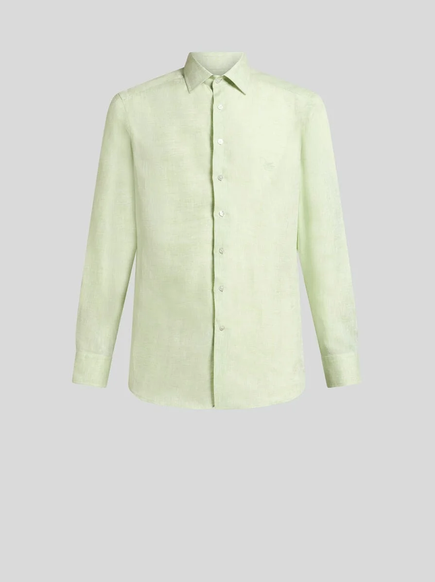 Straight-cut shirt in plain-coloured pure linen fabric with slub effect. The tonal embroidered ETRO monogram and iconic Pegaso symbol stand out on the chest. • Roma fit • Three-button working cuffs • Made in Italy • The model is 6' 1½" (187 cm) tall and wears a size 39 PRODUCT DETAILS • 100% linen