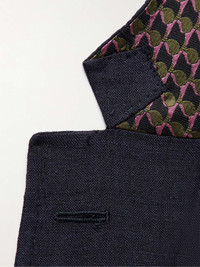 Etro's suit jacket has been crafted in Italy from breathable slub linen, so it's the perfect warm-weather alternative to traditional wool tailoring. It features a jacquard-woven undercollar and smooth satin lining in a vibrant, colourful print. Size & Fit - Those with broad shoulders may wish to take the next size up - Lightweight, non-stretchy fabric - Model is shown wearing an IT 50 - Model measures: chest 38"/ 96cm, height 6'2"/ 182cm Details & Care - Navy slub linen - Notch lapels, non-functioning buttoned cuffs, chest welt pocket, two front flap pockets, back vent, two internal slip pockets, fully lined - Two button fastening - 100% linen; lining1: 50% viscose, 50% cupro; lining2: 100% viscose - Dry clean - Made in Italy