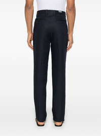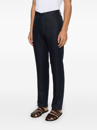 linen tapered-leg trousers Highlights - Midnight blue - Concealed fly and button fastening - Belt loops - Two diagonal pockets to the sides - Two rear button-fastening jetted pockets Made in Italy Composition Linen/Flax 100% SIZE & FIT Model measurements Height 6 ft 2 in(1.87 m) Bust/Chest 38.18 in(97 cm) Hips 36.61 in(93 cm) Waist 29.13 in(74 cm) FittingInformation Designed for a slim tapered leg, offering a close fit that sits just away from the leg with a closer fit towards the ankle The unfinished hems allow for the length to be altered Made from a lightweight non-stretch fabric