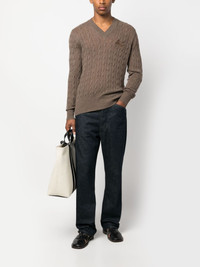 logo-embroidered cashmere jumper Highlights - Coffee brown - Cashmere - Cable knit - Signature pegaso motif - Embroidered logo at the chest - Ribbed v-neck - Long sleeves - Ribbed cuffs and hem Made in Italy Composition Cashmere 100% SIZE & FIT Model measurements Height 6 ft 1 in(1.85 m) Bust/Chest 38.58 in(98 cm) Hips 37 in(94 cm) Waist 30.31 in(77 cm) FittingInformation Designed for a regular fit, offering a comfortable loose fit throughout the body Made with a lightweight knit, this piece offers some stretch This piece fits true to size – take your usual size Washing instructions Dry Clean Only