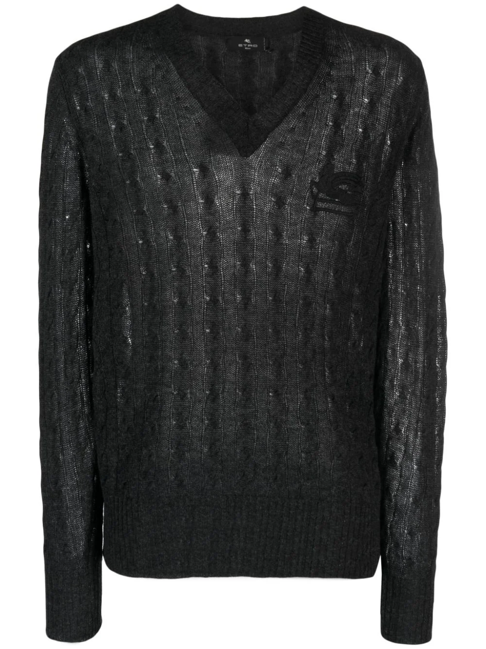 logo-embroidered cashmere jumper Highlights - Charcoal grey - Cashmere - Cable knit - Signature pegaso motif - Embroidered logo at the chest - Ribbed v-neck - Long sleeves - Ribbed cuffs and hem Made in Italy Composition Cashmere 100% SIZE & FIT Model measurements Height 6 ft 2 in(1.89 m) Bust/Chest 37.4 in(95 cm) Hips 35.03 in(89 cm) Waist 27.95 in(71 cm) FittingInformation Designed for a regular fit, offering a comfortable loose fit throughout the body Made with a lightweight knit, this piece offers some stretch This piece fits true to size – take your usual size Washing instructions Dry Clean Only