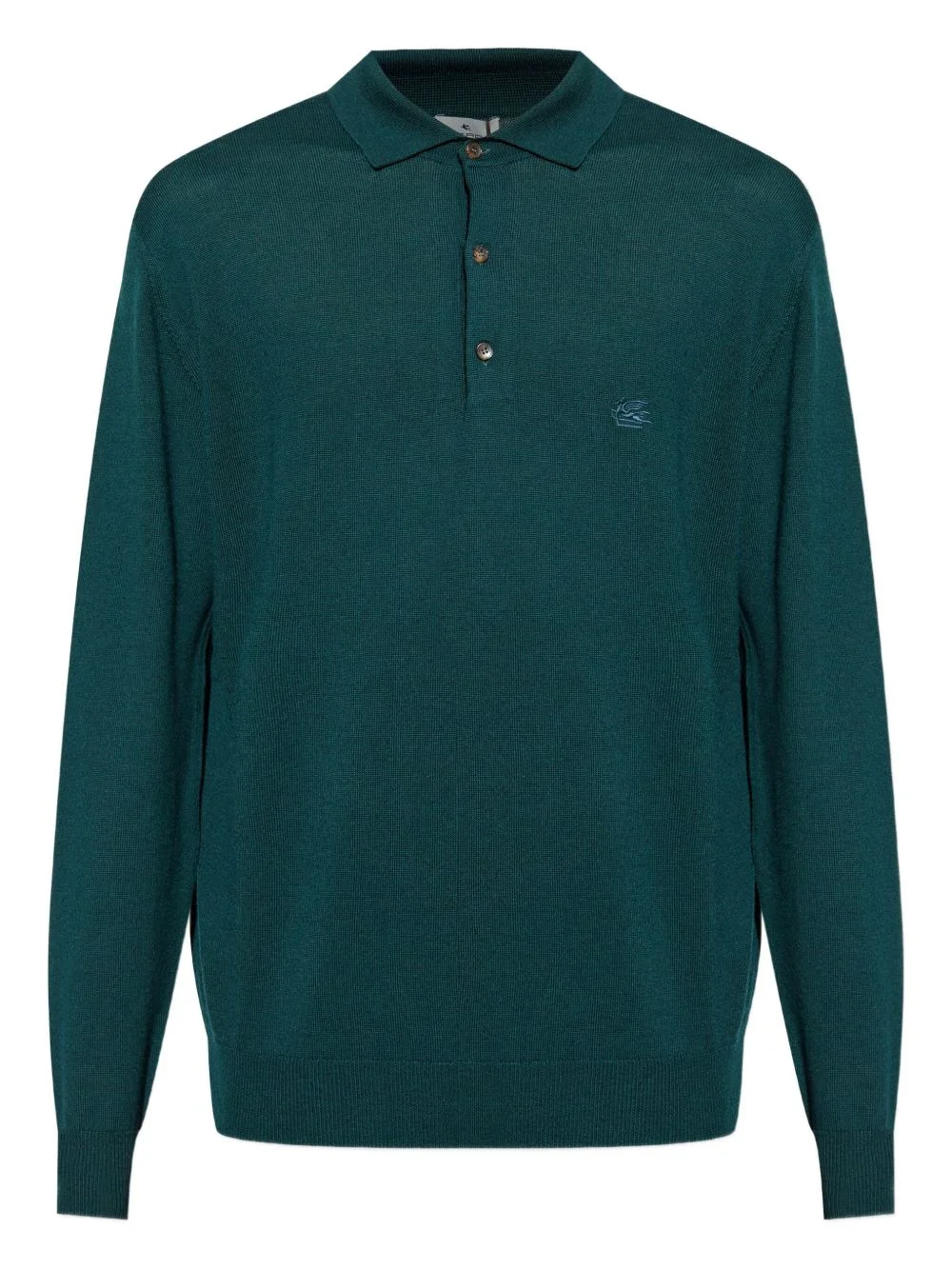 long-sleeve polo shirt Highlights - Teal - Wool knit - Button placket - Embroidered logo - Long sleeves - Ribbed trims Imported Composition Wool 100% SIZE & FIT FittingInformation Designed for a relaxed fit, this polo shirt offers comfort and movement The ribbed hem offers a close, comfortable fit Made from a midweight non-stretch fabric, this piece offers minimal elasticity when worn Washing instructions Read Manufacturer Guidelines