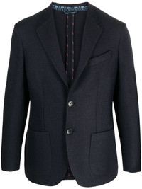 Tie-pattern jacquard blazer Tailored in Italy, this Etro blazer is crafted with the brand's signature Tie print in a subtle patterned jacquard. Classic detailing elevates its elegance, while an unlined interior allows for versatility in styling. Highlights - Midnight blue - Patterned jacquard - Notched lapels - Front button fastening - Long sleeves - Buttoned cuffs - Chest welt pocket - Two side patch pockets - Straight hem Made in Italy Composition Lining: Viscose 52%, Acetate 48% Outer: Acrylic 74%, Polyester 26% SIZE & FIT Model measurements Height 6 ft 2 in(1.87 m) Bust/Chest 36.61 in(93 cm) Hips 35.03 in(89 cm) Waist 27.95 in(71 cm) FittingInformation Designed for a slim fit, offering a comfortable fit that sits just away from the body The vented hem offers movement at the rear Made from a midweight non-stretch fabric This piece fits true to size – take your usual size Washing instructions Dry Clean Only