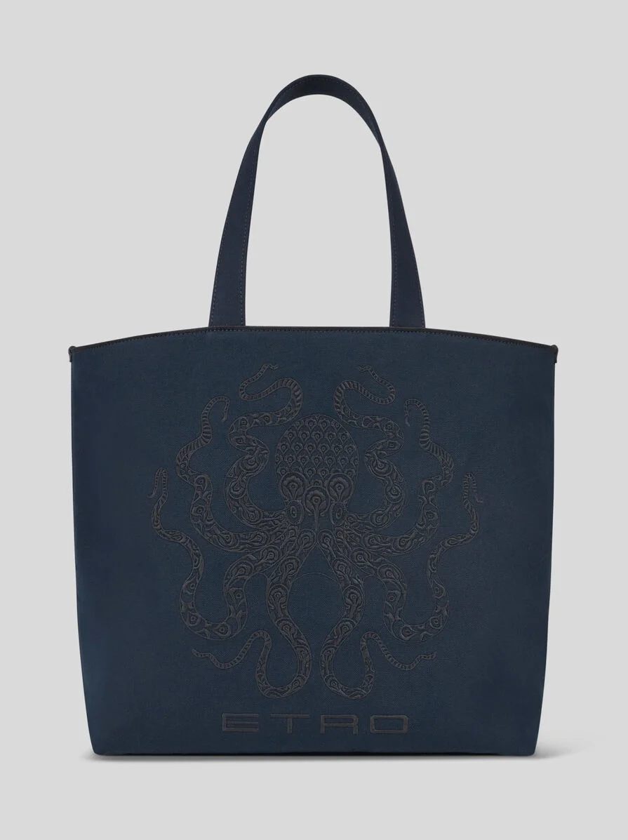 Maxi cotton tote bag with leather trims. The accessory features an embroidered octopus and ETRO logo on the front. • Size (Width, Height, Depth): 13.8 x 14.6 x 7.1 inches (35 x 37 x 18 cm) • Zipped internal slip pocket • Two handles • Made in Italy PRODUCT DETAILS • 100% cotton • Detailing: calfskin • Embroidery: 100% polyester thread • Lining: 100% cotton