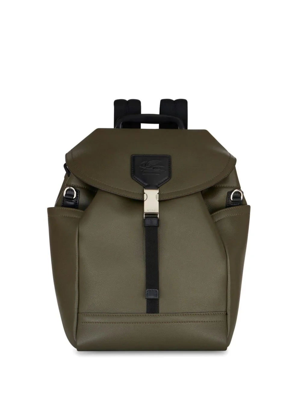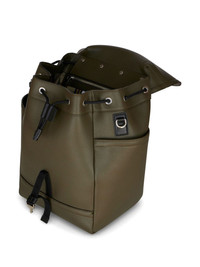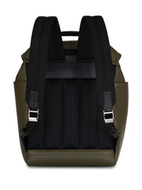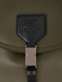 medium leather backpack Highlights - Calf leather - Olive green - Applique logo - Foldover top - Buckle fastening - Drawstring fastening - Two padded adjustable shoulder straps - Padded panels - Two side slit pockets - Internal zip-fastening pocket - Full lining Made in Italy Composition Outer: Polyester 100%, Calf Leather 100%