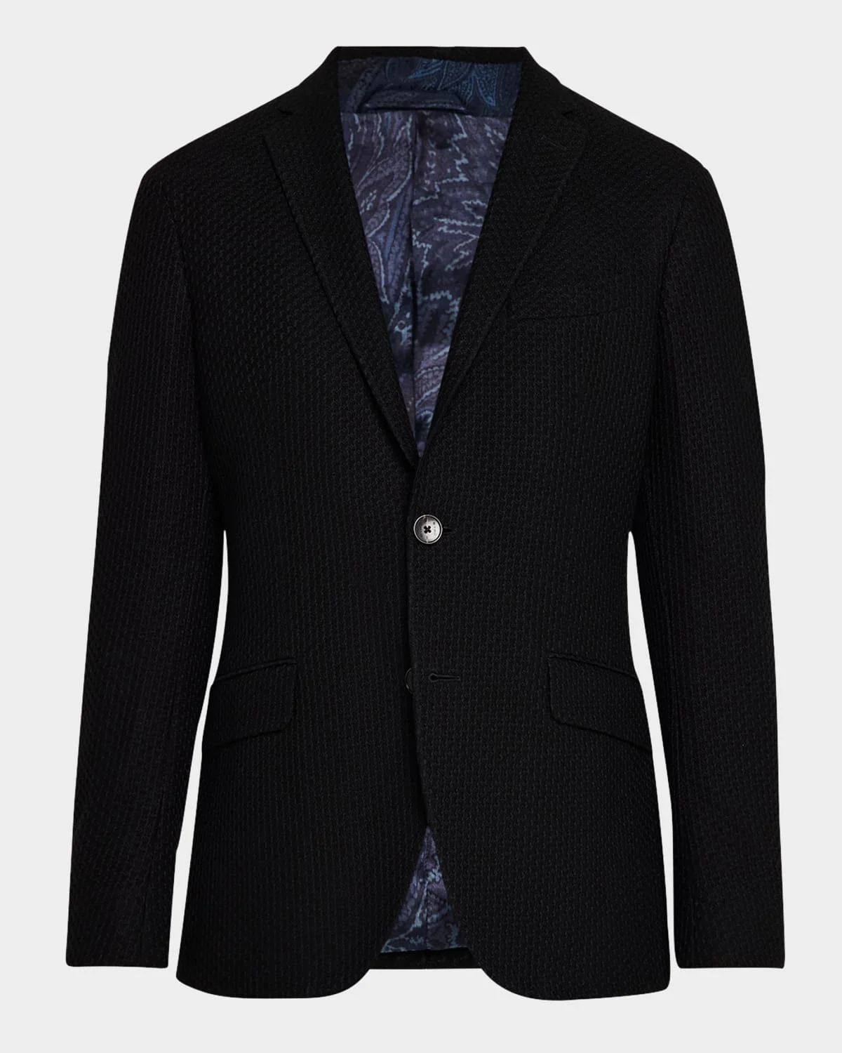 - Etro blazer in textured cotton weave - Notched lapels - Two-button closure - Chest welt pocket - Side flap pockets - Four-button cuffs - Double-vented back - Lining: Polyester/viscose - Made in Italy - Model is 6'1"/185cm.