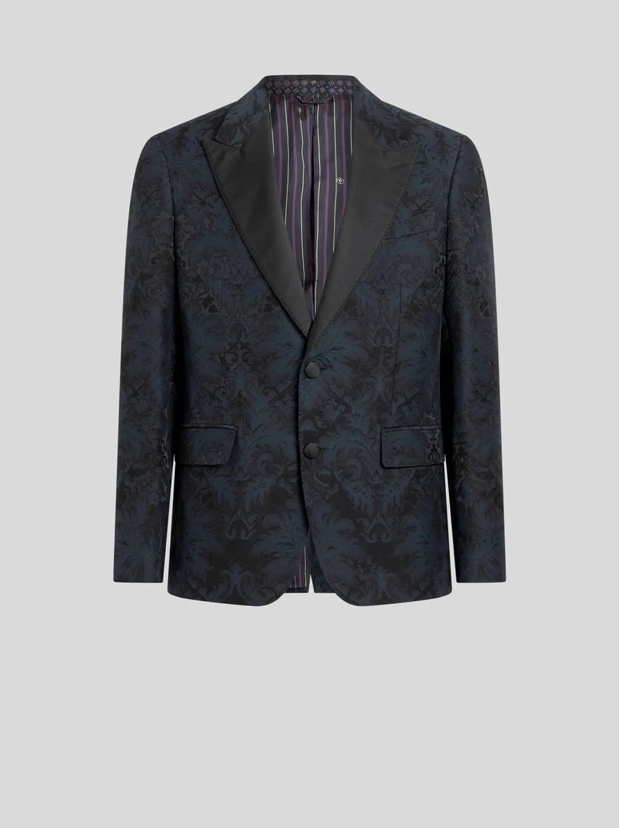 Single-breasted evening blazer in cotton- and silk-blend fabric with all-over floral jacquard motif. Completing the model are plain-coloured lapels. • Regular fit • Peak lapels • Single-breasted two-button closure • Side slip pockets with flap • Rear vent • Made in Italy • The model is 6' 1½" (187 cm) tall and wears a size 48 PRODUCT DETAILS • 89% cotton, 11% silk • Lapels: 78% silk, 22% polyester • Lining: 53% viscose, 47% acetate