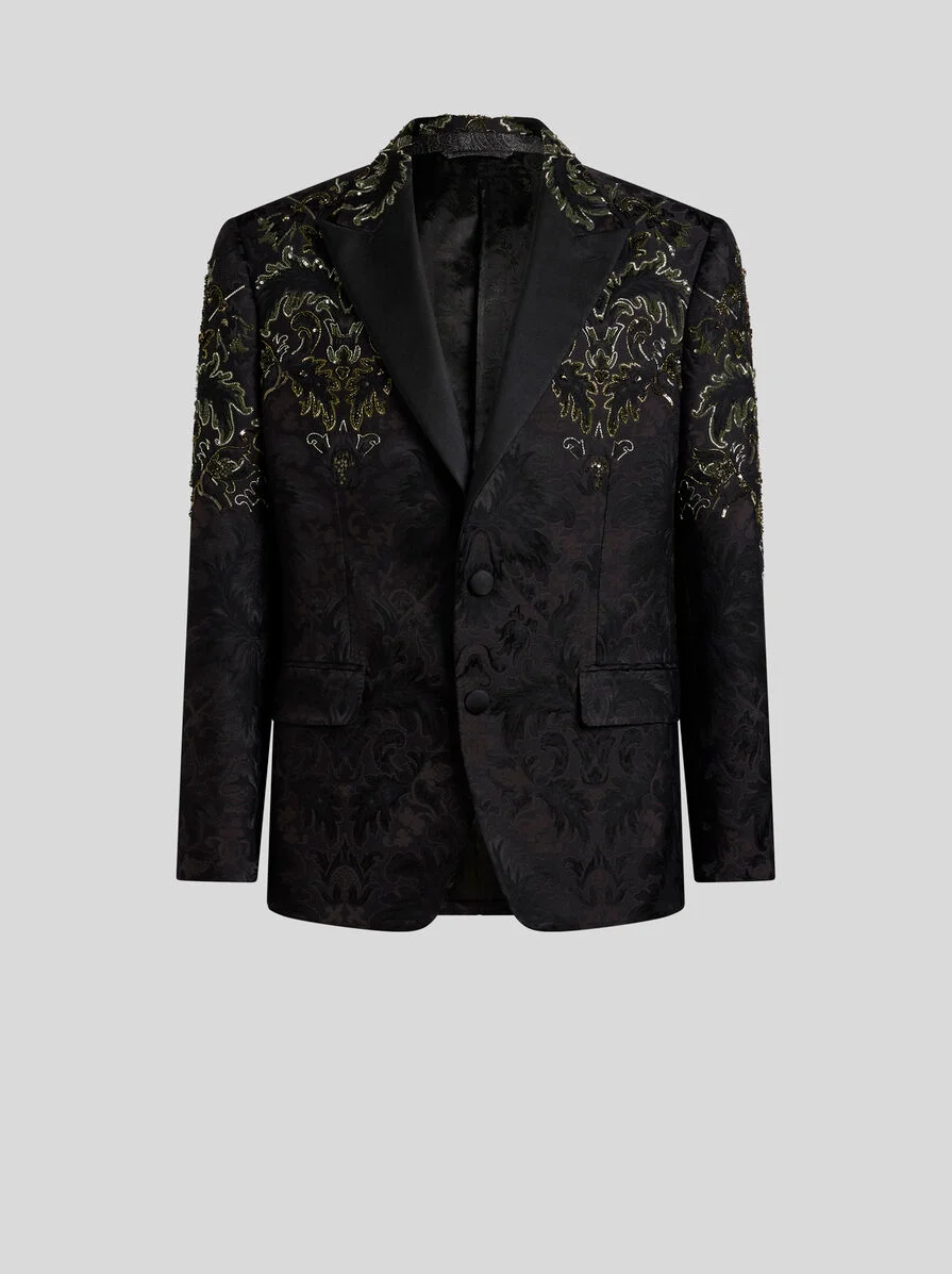 Single-breasted evening blazer in silk-blend fabric with all-over floral motif. At the top of the garment, the pattern is underscored by bright bead and sequin embroidery following the lines of the flowers and leaves. • Regular fit • Peak lapels • Single-breasted two-button closure • Side slip pockets with flap • Made in Italy • The model is 6' 1½" (187 cm) tall and wears a size 48 PRODUCT DETAILS • 53% viscose, 25% polyamide, 22% silk • Lapels: 78% silk, 22% polyester • Lining: 100% viscose
