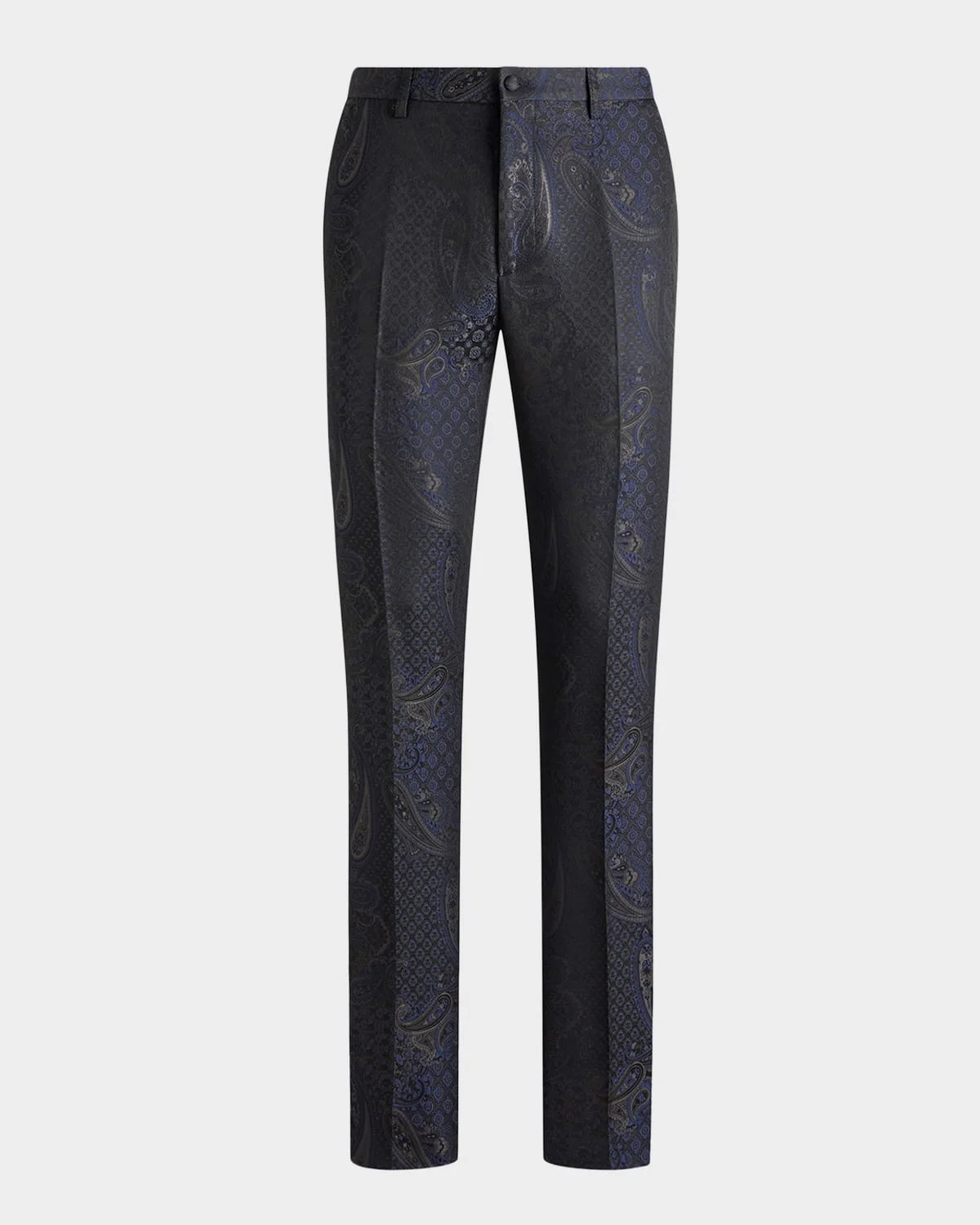 These Etro trousers exemplify Italian craftsmanship and subtle elegance with an allover tonal paisley jacquard pattern. Regular rise Flat front Side slip pockets Buttoned back besom pockets Classic fit through straight legs Buttonzip front; belt loops Polyester/cotton/nylon/polyamide Professional cleaning recommended Made in Italy