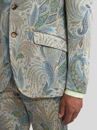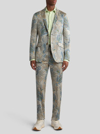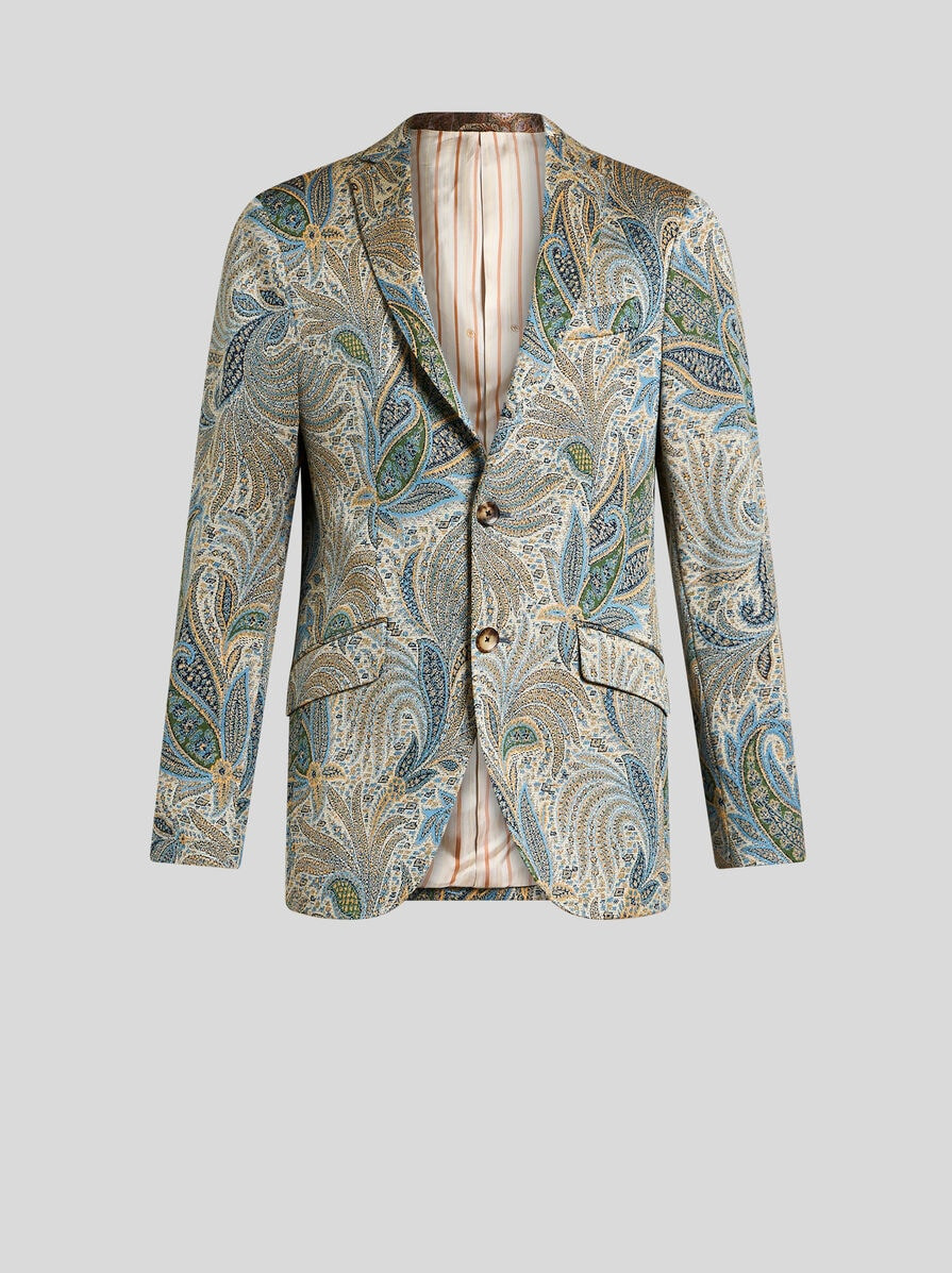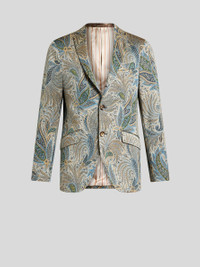 Single-breasted blazer in stretch cotton-blend fabric. This model features an all-over foliage print. The contrasting inner collar and undercollar complement the piece. • Roma regular fit • Classic lapels • Single-breasted closure with two horn buttons • Welt breast pocket • Two flap pockets at the front • Cuffs with four buttons • Made in Italy • The model is 6' 1½" (187 cm) tall and wears a size 48 PRODUCT DETAILS • 70% cotton, 25% polyester, 5% elastane