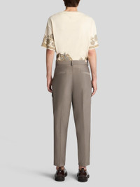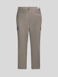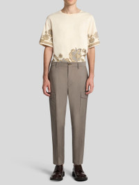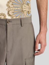 Tapered tailored trousers in a wool and cotton blend. This model is distinguished by the cargo maxi-pockets on the side of the legs. The label with ETRO lettering on the back of the waist complements the piece. • Regular fit • High waist • Concealed zip and button closure • Cargo pockets • Side slip pockets • Rear welt pockets • Made in Italy • The model is 6' 1½" (187 cm) tall and wears a size 48 PRODUCT DETAILS • 70% wool, 30% cotton