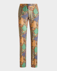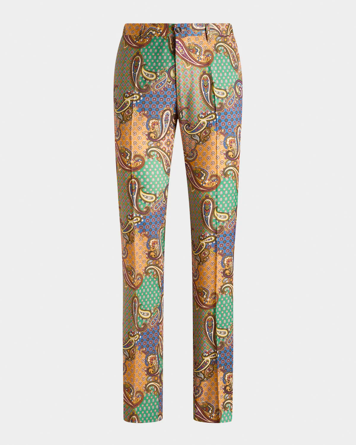 These Etro wool trousers offer a distinctive allover patchworkeffect print showcasing alternating paisley, floral, and geometric motifs. Regular rise Flat front Side slip pockets Back besom pockets Classic fit through straight legs Buttonzip front; belt loops Wool Lining: Acetate/viscose Professional cleaning recommended Made in Italy