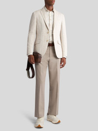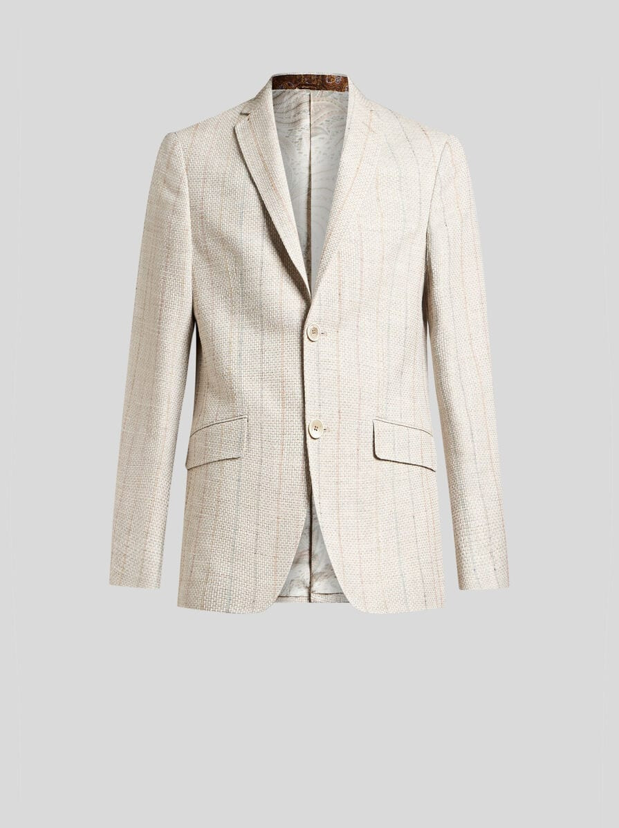 Single-breasted blazer in a cotton, wool and linen blend decorated with a micro pattern and a multi-coloured thin stripe pattern. This piece features a tonal foliage print on the lining. The contrasting undercollar and inner collar complement the design. • Roma regular fit • Classic lapels • Single-breasted closure with two branded buttons • Welt breast pocket • Front pockets with flap • Cuffs with four buttons • Made in Italy • The model is 6' 1½" (187 cm) tall and wears a size 48 PRODUCT DETAILS • 56% cotton, 22% wool, 21% linen, 1% silk • Bodice lining: 100% viscose • Sleeve lining: 53% viscose, 47% acetate