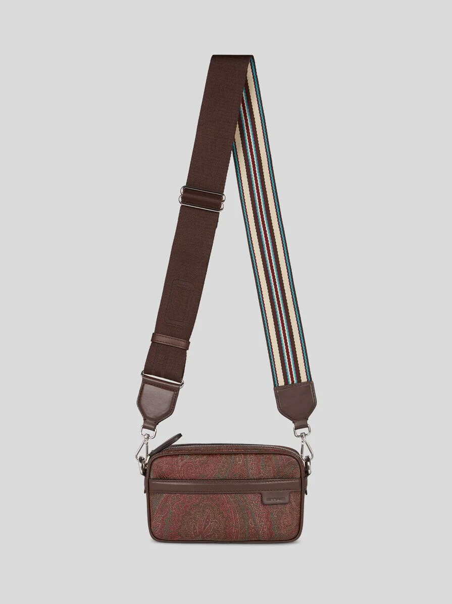 Camera case in iconic Paisley jacquard fabric with shoulder strap and Etro logo-branded leather details. This model has a practical, clasp-detachable shoulder strap with a striped pattern on the inner side. • Dimensions (Width, Height, Depth): 7.9 x 4.5 x 2.2 inches (20 x 11.5 x 5.5 cm) • Detachable adjustable shoulder strap • Zip closure • Front pocket • Internal zip pocket • Golden-finish metal details • Made in Italy PRODUCT DETAILS • Exterior: Paisley jacquard cotton fabric coated with matt texture and lined with canvas • Coating: 100% PVC • Trims: calfskin • Ribbon: 95% polyester, 5% polyamide • Lining: 100% polyester and details in calfskin