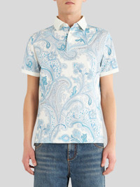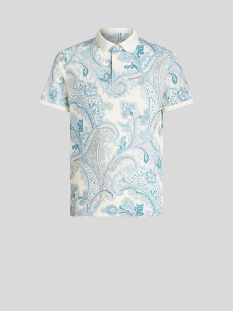 Cotton jersey polo shirt decorated with ornamental Paisley designs and featuring the ETRO logo and embroidered Pegaso on the chest. PRODUCT DETAILS • 100% cotton • Regular fit • Made in Italy • The model is 188 cm / 74,01 inches tall and wears size M