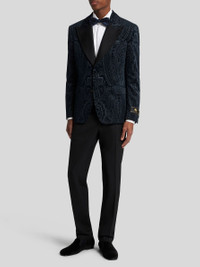 Cotton velvet evening blazer, decorated with a metallic placed paisley print, reconstructed all over. This model is embellished with a tailored label, hand-stitched onto the cuff. It features a contrasting paisley undercollar and a lining embellished with a tone-on-tone floral striped design. • Regular fit • Silk cannete peak lapels • Single-breasted closure with jewelled buttons • Welt breast pocket • Side flap pockets • Cuffs with jewelled buttons • Rear vent • Made in Italy • The model is 6’2” (188 cm) tall and wears a size 48 (IT) PRODUCT DETAILS • 100% cotton • Lining: 100% viscose