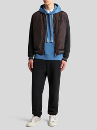 Technical canvas bomber jacket with Paisley motif on the front. This model is embellished with an embroidered Pegaso symbol and ETRO logo on the chest. Features striped knit hems. • Regular fit • Two-way zip closure • Side slip pockets • Ribbed, collar, cuffs and hem • Made in Hungary • The model is 74.02 inches (188 cm) tall and wears a size M PRODUCT DETAILS • Outside: 100% polyester patterned fabric • Back, sleeves: 65% polyester, 31% cotton, 4% elastane • Collar, cuffs, hem: 50% wool, 50% acrylic • Lining: 100% Polyester • Filling: 100% Polyester