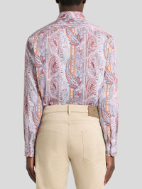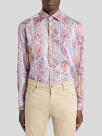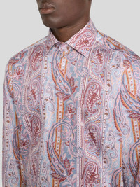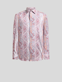 Pure cotton satin shirt. This garment features an all-over Paisley motif interspersed with vertical stripes and enhanced by leafy-inspired details. • Regular fit • Pointed collar, 3.1 inches (8 cm) wide • Branded-button closure • Double-buttoned working cuffs • Made in Italy • The model is 6' 1" (186 cm) tall and wears a size 39 PRODUCT DETAILS • 100% cotton