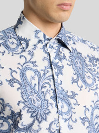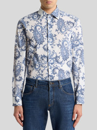 Stretch cotton shirt with all-over Paisley motif enhanced by leafy-inspired elements. • Regular fit • Pointed collar • Branded-button closure • Double-buttoned working cuffs • Made in Italy • The model is 6' 1" (186 cm) tall and wears a size 39 PRODUCT DETAILS • 97% cotton, 3% elastane