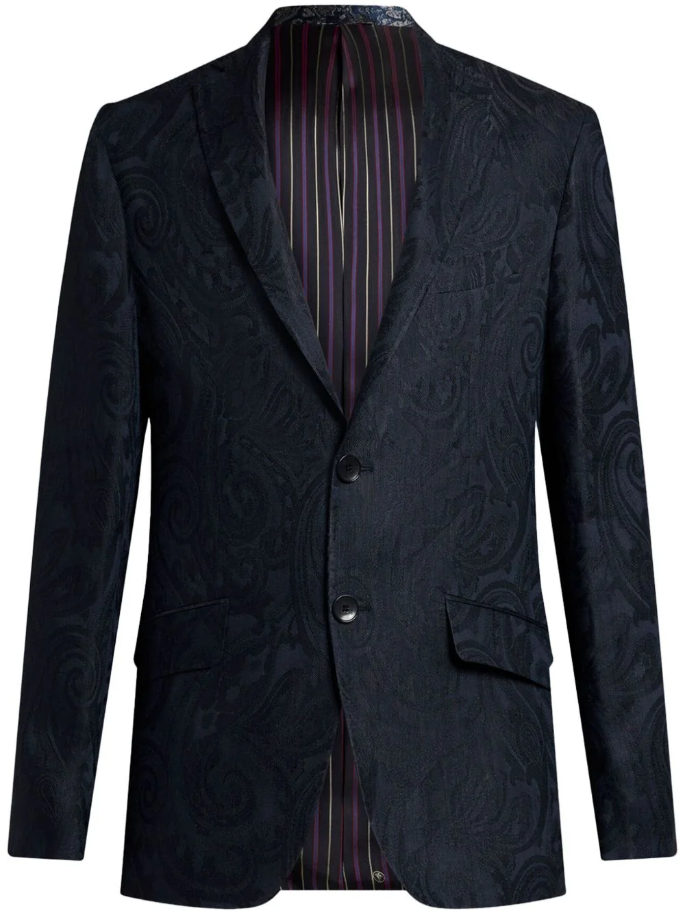 paisley-jacquard blazer Highlights - Midnight blue - Front button fastening - Patterned jacquard - Notched lapels - Long sleeves - Buttoned cuffs - Chest welt pocket - Two front flap pockets - English rear vents - Striped lining - Curved hem Made in Italy Composition Outer: Linen/Flax 52%, Viscose 48% Lining: Viscose 53%, Acetate 47%