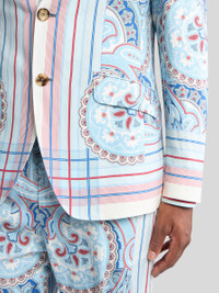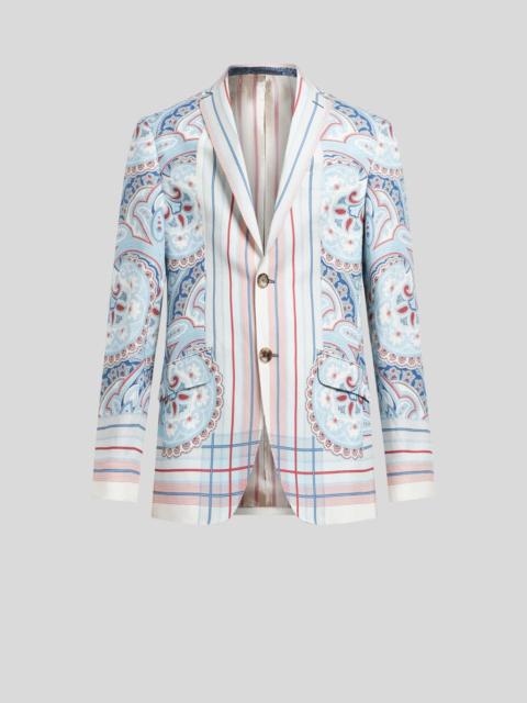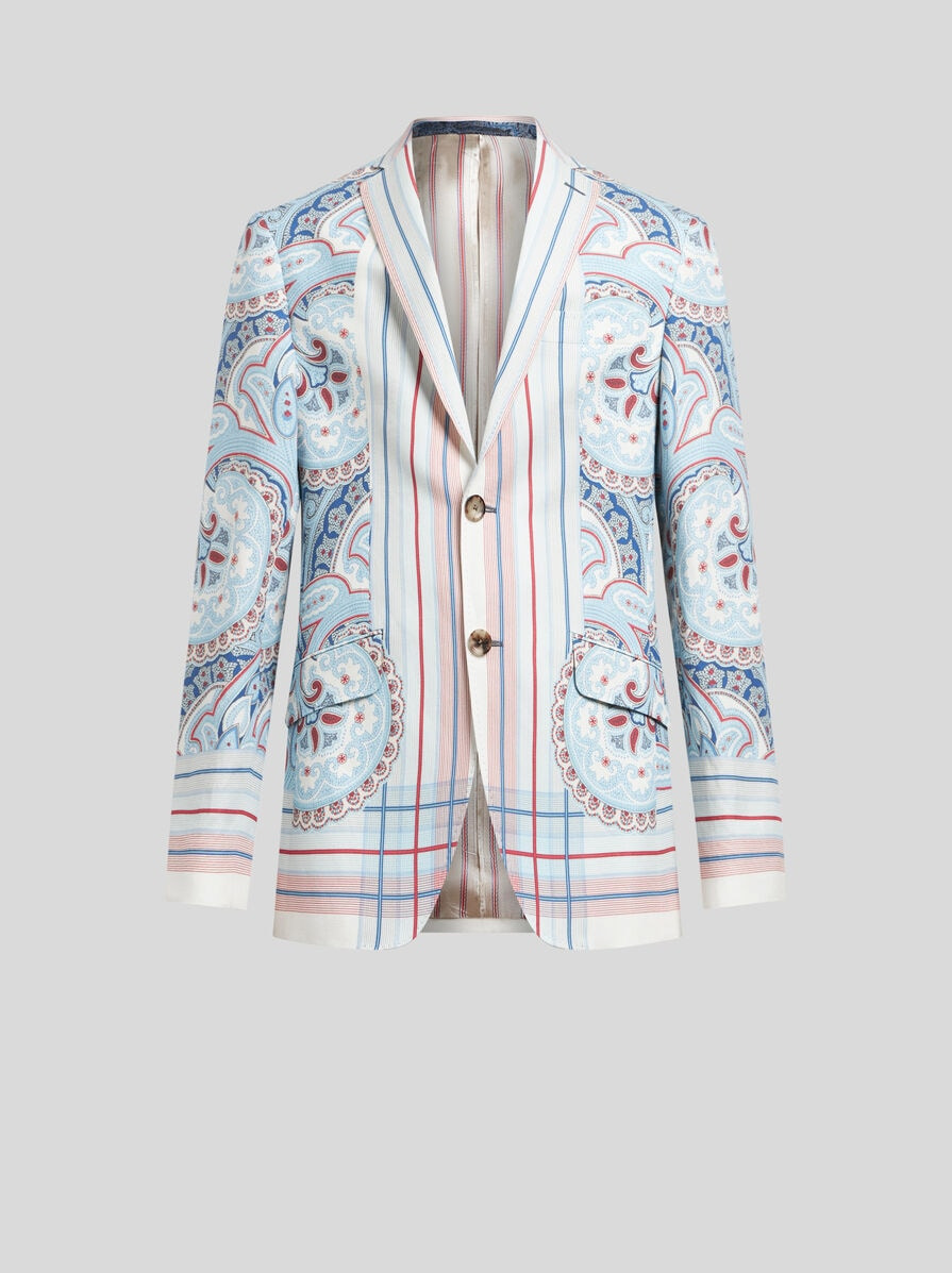 Single-breasted blazer with Paisley motif in delicate shades, accompanied by stripes in the middle and at the bottom. Inner lining embellished with printed vertical stripes of varying width. • Roma regular fit • Single-breasted two-button closure • Front pockets with flap • Made in Italy • The model is 6' 1½" (187 cm) tall and wears a size 48 PRODUCT DETAILS • 68% lyocell, 32% linen • Lining: 52% viscose, 48% acetate