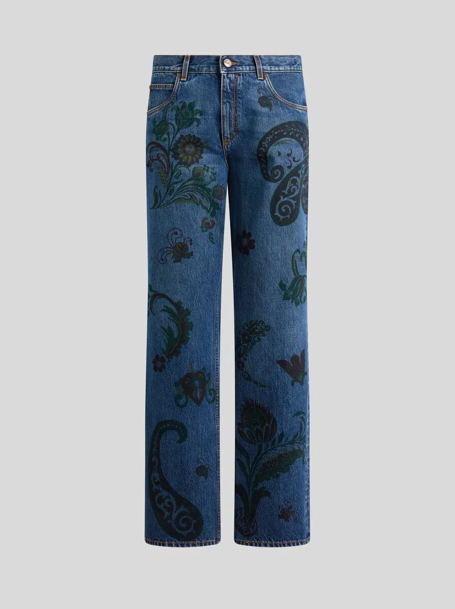 Straight-leg jeans in slightly stretchy, vintage-effect one-wash denim with overprint featuring macro Paisley and foliage motifs. The item was presented at the Autumn-Winter 25 Runway Show. • Regular fit • Five pockets • Pegaso button and zip closure • Bottom opening: 9.4 inches (24 cm) • Made in Italy • The model is 6' 1" (186 cm) tall and wears a size 32 PRODUCT DETAILS • 98% cotton, 2% elastane