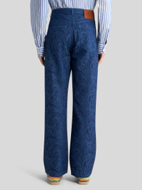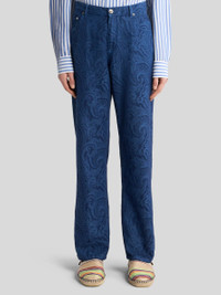 Straight-leg five-pocket jeans. This model is made from cotton and linen-blend denim embellished with an all-over floral Paisley print. Completing the garment are, a metal button with raised Pegaso logo and label with Pegaso symbol and ETRO logo. • Comfort fit • Five pockets • Bottom opening: 9.4 inches (24 cm) • Concealed zip and Pegaso button closure • Made in Italy • The model is 6' 1½" (187 cm) tall and wears a size 32 PRODUCT DETAILS • 57% cotton, 43% linen