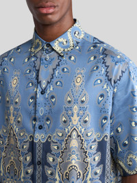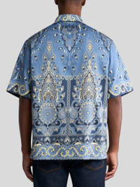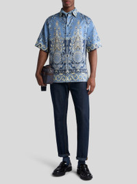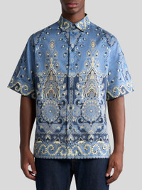 Oversized shirt in pure cotton. This model features a placed maxi medallion and Paisley print and a geometric floral motif. • Oversized fit • Straight-point collar • Branded-button closure • Short sleeves • Made in Italy • The model is 6' 1½" (187 cm) tall and wears a size M PRODUCT DETAILS • 100% cotton